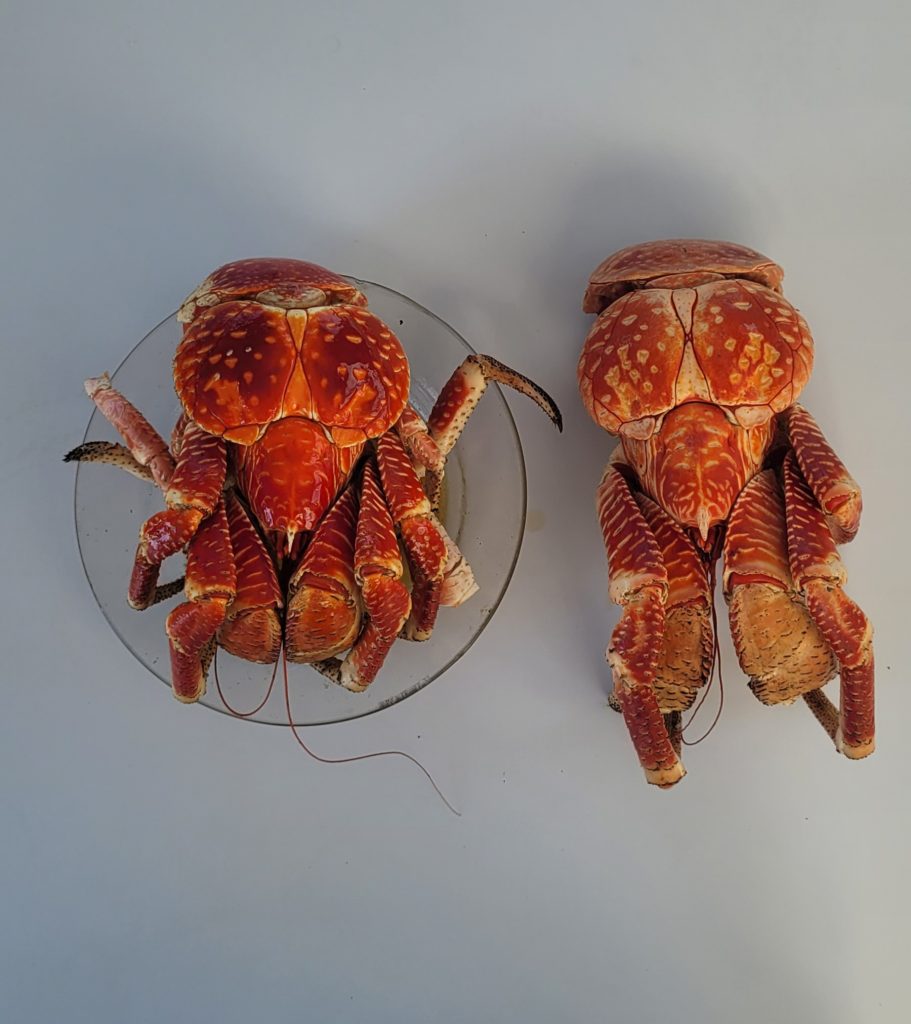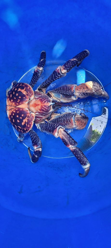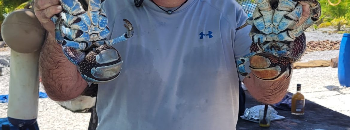 Le crabe de cocotier est le plus imposant des crabes il peut peser jusqu’à 4 Kilos. Il fait plutôt parti de la famille des « Bernard l’hermite ». Ce n’est pas un crabe au sens strict. Il vit dans les cocoteraies, il creuse un tunnel bien à l’abri des regards. Il a un odorat très développé. il mange principalement des noix de coco qu’il est capable de casser avec ses énormes pinces munies de dents. J’ai pu faire une partie de chasse avec Nicolas et Malice sur un motu. Excellent souvenir.