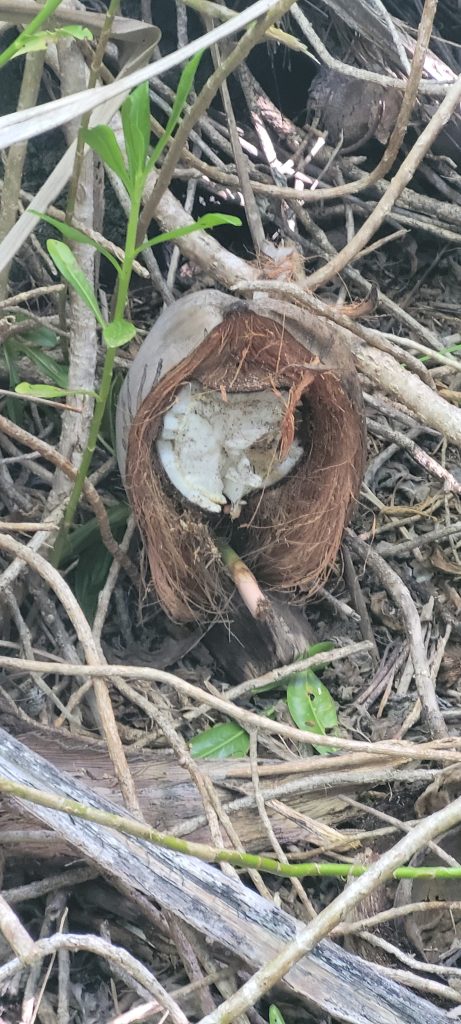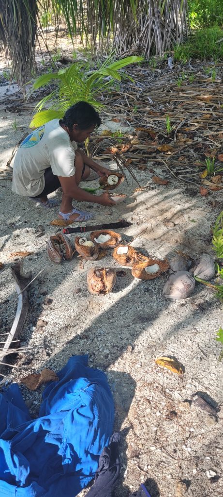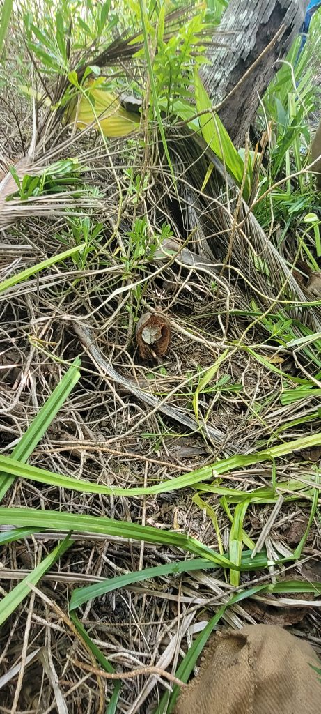 Les pièges sont fait d’une demi noix de coco attachée à une branche pas très loin du nid du crabe