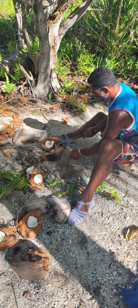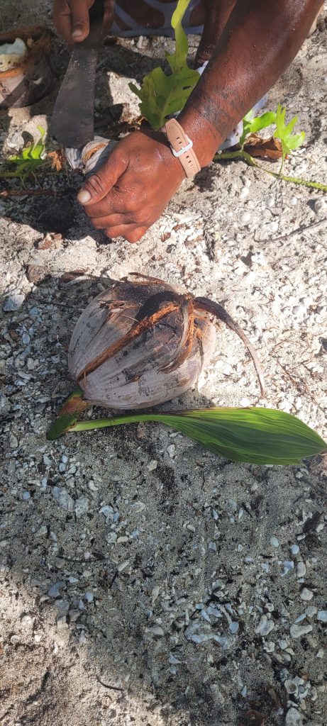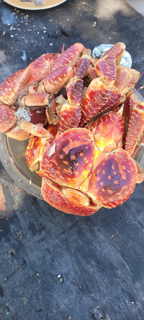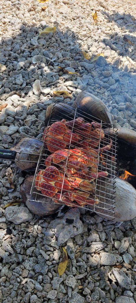 Nicolas fait cuire les crabes dans l’eau de mer et au four dans une marmite. C’est délicieux le goût est très légèrement sucré à la nourriture à base de coco. Pour moi c’est le meilleur crustacé que j’ai mangé mieux que la langouste et le homard. Dans la queue il y a une partie le foie qui se mange. C’est le foie gras polynésien. j’adore !