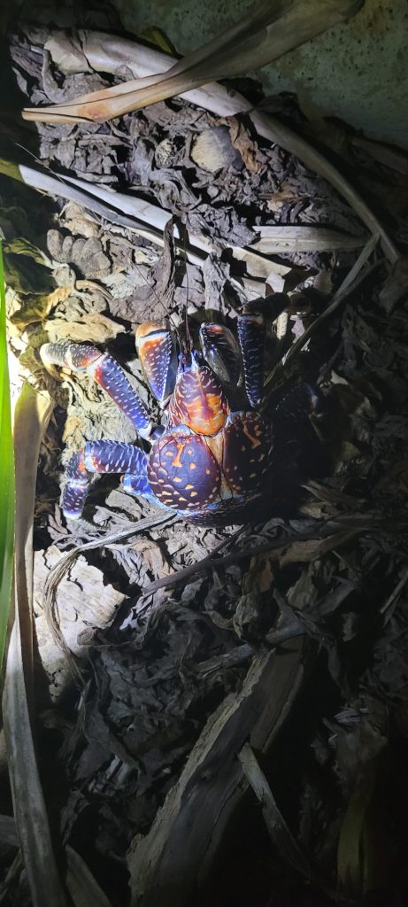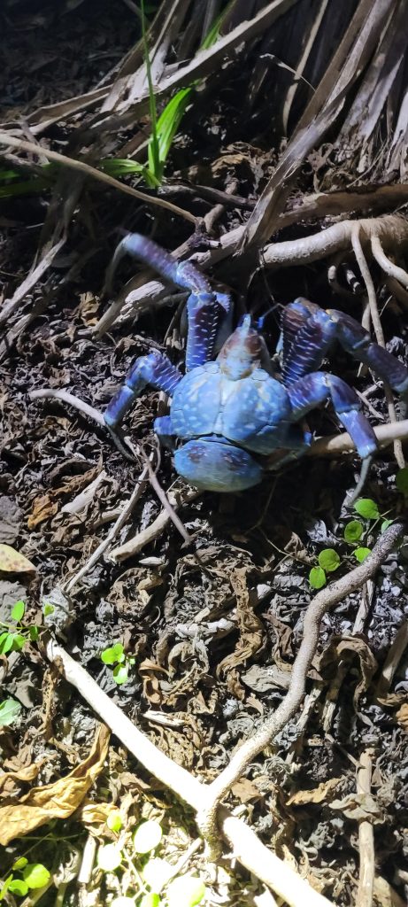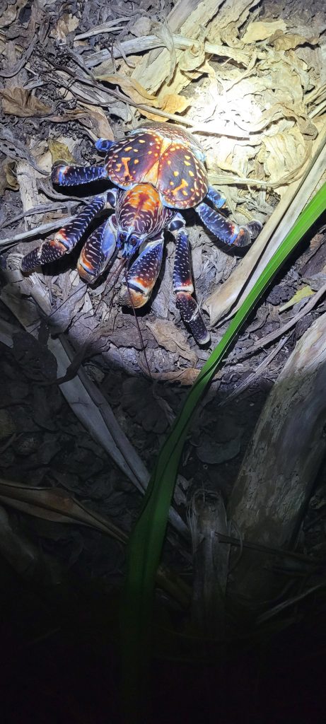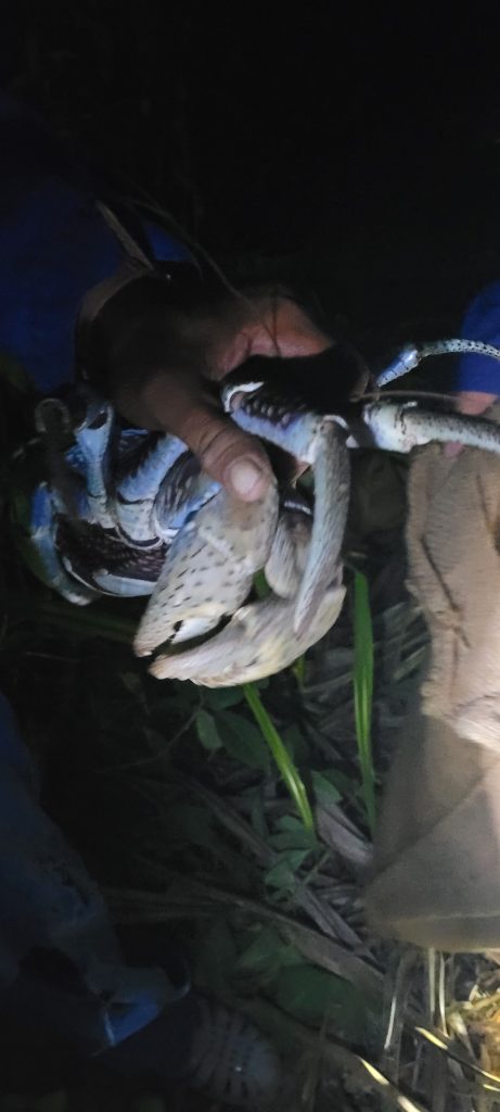 La chasse se passe la nuit. Il faut retrouver où les noix de coco ont été suspendues. Pour un novice comme moi qui ne connait pas le terrain ce n’était pas facile. Les locaux ont bien rigolé ! Le crabe est accroché à la coco et rien ne le perturbe quand il mange. il faut dissocier les petits (qui pour moi étaient gros) les femelles et ne prendre que les mâles imposants.